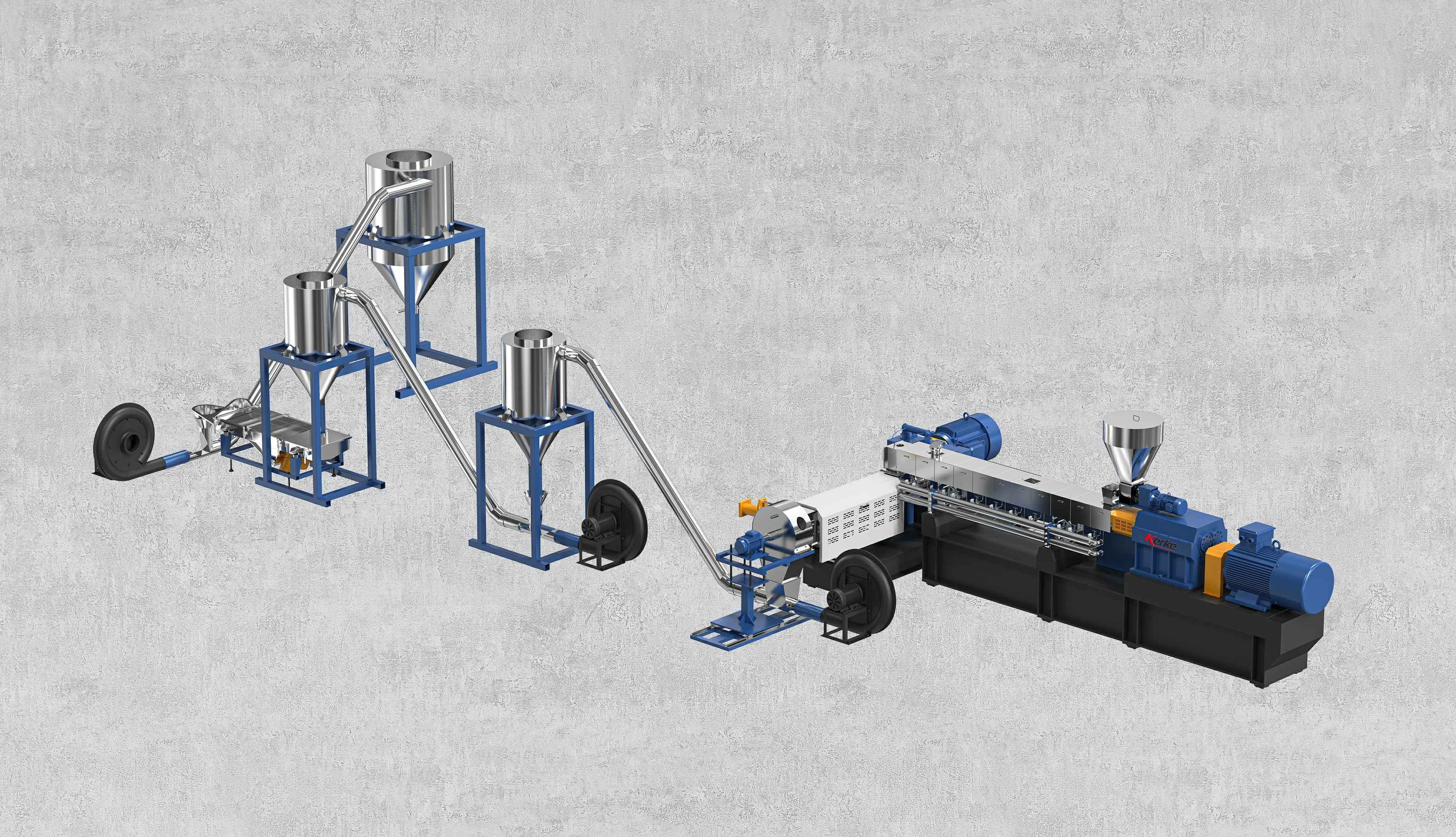 1.高混機(jī) | 2.輔助喂料機(jī) | 3.雙螺桿擠出機(jī) |