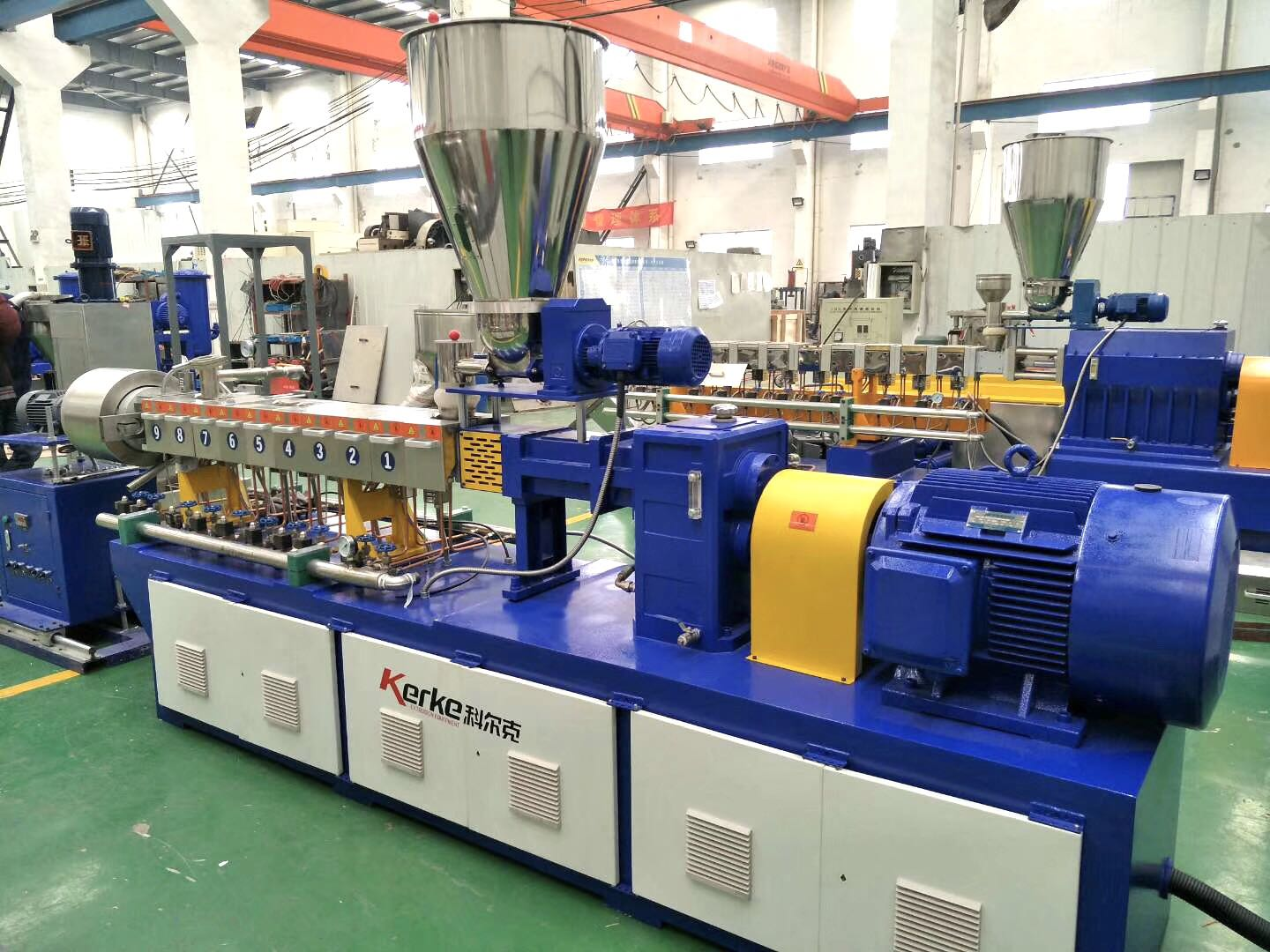 2021年3月常州客戶蒞臨我司,對(duì)LDPE進(jìn)行試料,試料過(guò)程十分順利,客戶對(duì)我司雙螺桿水環(huán)熱切造粒設(shè)備非常滿意。水環(huán)熱切系統(tǒng),是在熱的情況下切粒,然后水流帶出,粒子均勻,切面圓整,無(wú)碎屑,粒子外表美觀性好;切粒模板出料的料條,立刻被旋轉(zhuǎn)的切刀切割成顆粒,不需拉絲過(guò)程,不用擔(dān)心拉絲切粒的斷絲過(guò)程,在一定程度上減少工人勞動(dòng)量。根據(jù)加工物料體系與工藝配方要求其長(zhǎng)徑比,機(jī)筒結(jié)構(gòu),螺桿排列,換網(wǎng)結(jié)構(gòu),排氣數(shù)量及位置,加料方式,電氣控制方式等,均可優(yōu)化合理配置。實(shí)現(xiàn)多功能,多用途來(lái)適應(yīng)加工高分子材料。